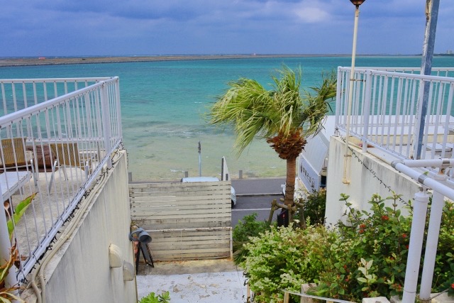 白い壁の建物とキレイな海、